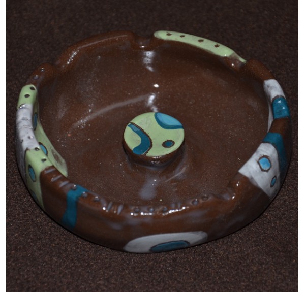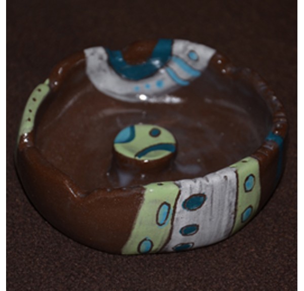 Ročno izdelan pepelnik iz črne gline in pobarvan. Premer 11,5 cm.